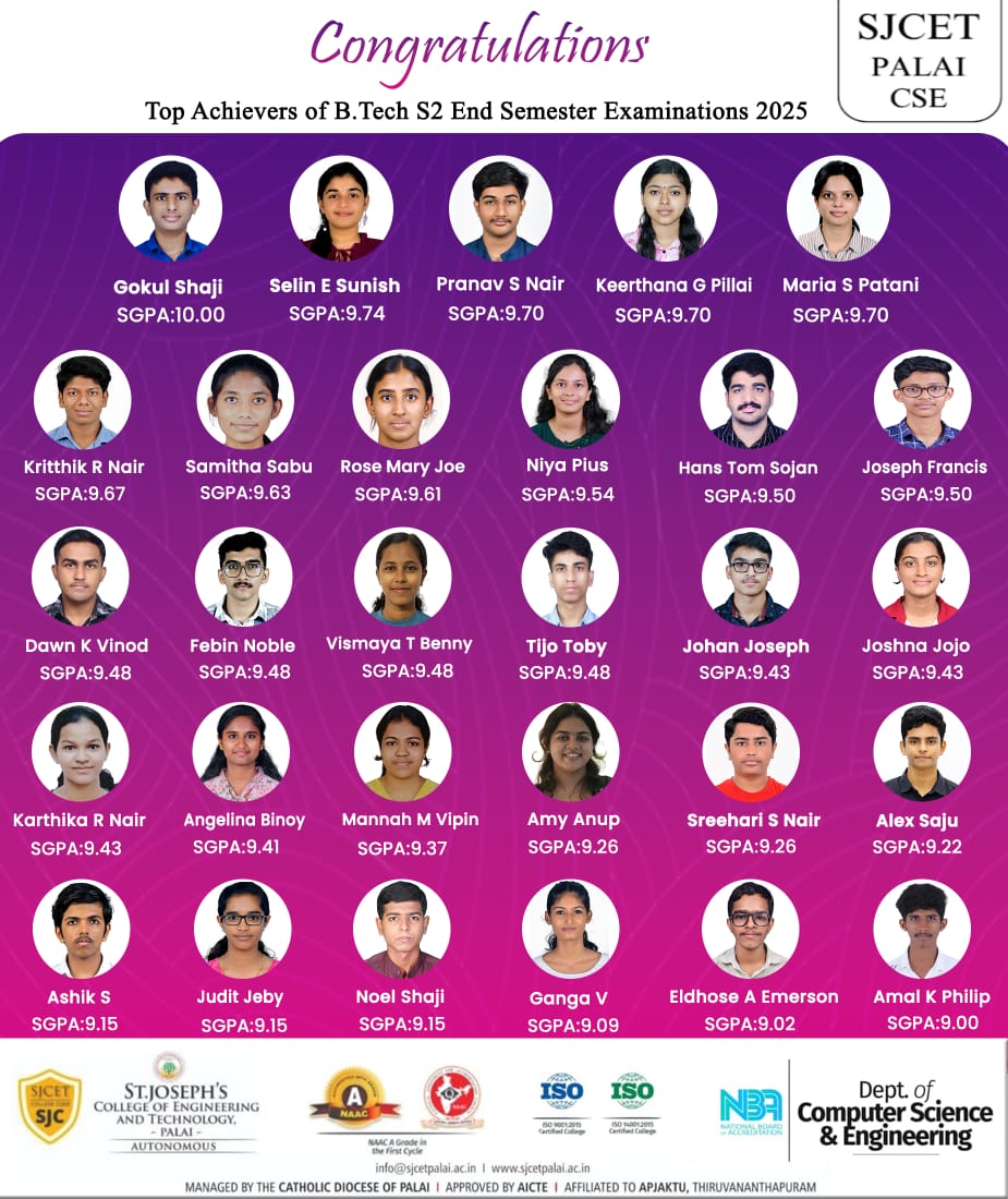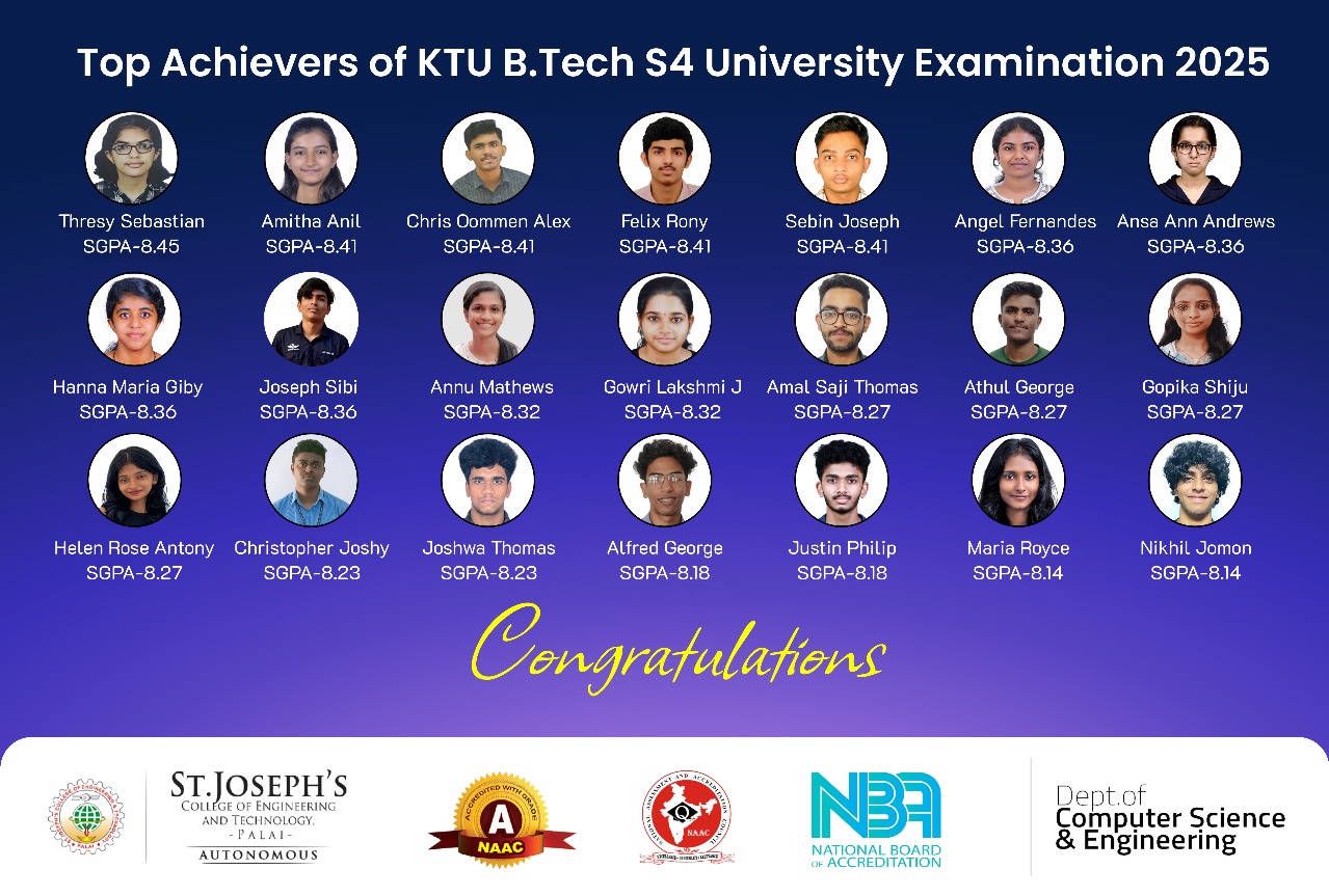 The Department of Computer Science and Engineering was established in the year 2002 and since its inception, the department has progressed with a vision and a strong commitment in developing competent Engineers with uncompromising standards of excellence in training, both through class room sessions and hands on sessions. The Department is equipped with competent and dedicated faculty members who are expertise in the current technologies. The department strives for uplifting the skill of the students to bring out innovative ideas from them with professionalism and ethical values. The department offers BTech (accredited by NBA), MTech and PhD programmes. The department is a recognized research centre of APJ Abdul Kalam Technological University, Thiruvananthapuram. The department has been maintaining an active interaction with the professional bodies like Computer Society of India and IEEE CS.