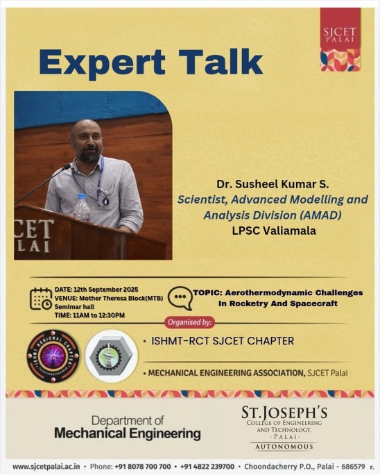 The One-Day annual colloquium, organized by the Indian Society of Heat and Mass Transfer – Regional Chapter Trivandrum (ISHMT-RCT) in association with the Department of Mechanical Engineering, St. Joseph’s College of Engineering and Technology, Palai, brings together experts, researchers, and students to explore advancements in space and thermal technologies. The colloquium will cover key topics such as: