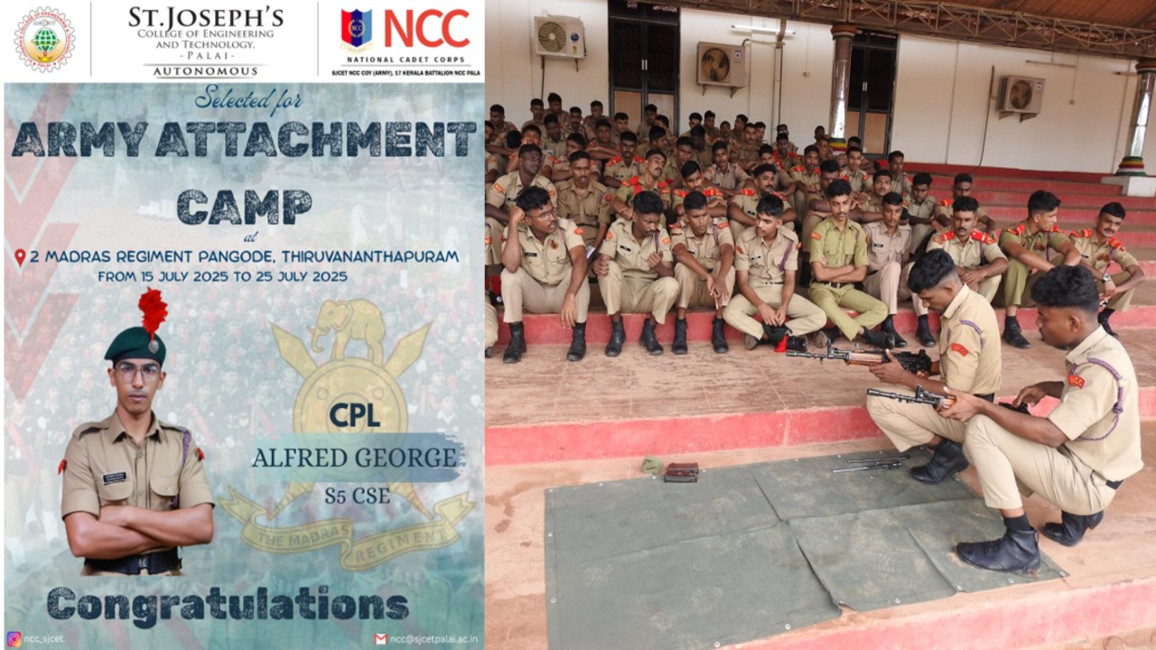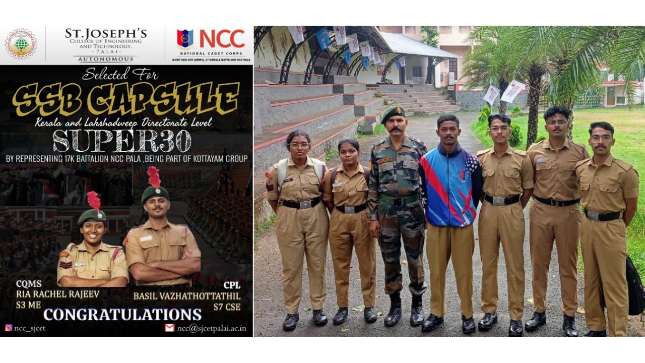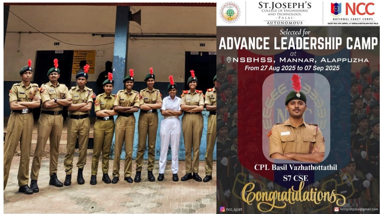 SJCET has the rare honour of being the first self-financing engineering college to have an NCC Coy (Army wing) with an authorized strength of 160 cadets under 17 Kerala Battalion NCC Pala.