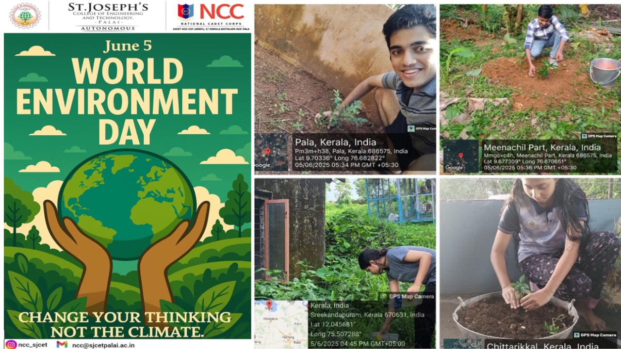 On June 5th, the NCC unit of SJCET Palai observed World Environment Day with great enthusiasm, reaffirming their commitment to environmental conservation. A total of 28 cadets participated in the program, comprising 14 Senior Division (SD) and 14 Senior Wing (SW) cadets. As part of the initiative, cadets planted saplings in their homes and surroundings, carried out cleaning activities in nearby water bodies, and actively spread awareness on the importance of preserving nature. Their collective efforts reflected the spirit of responsibility and service, contributing towards the vision of a cleaner, greener, and healthier planet for generations to come.