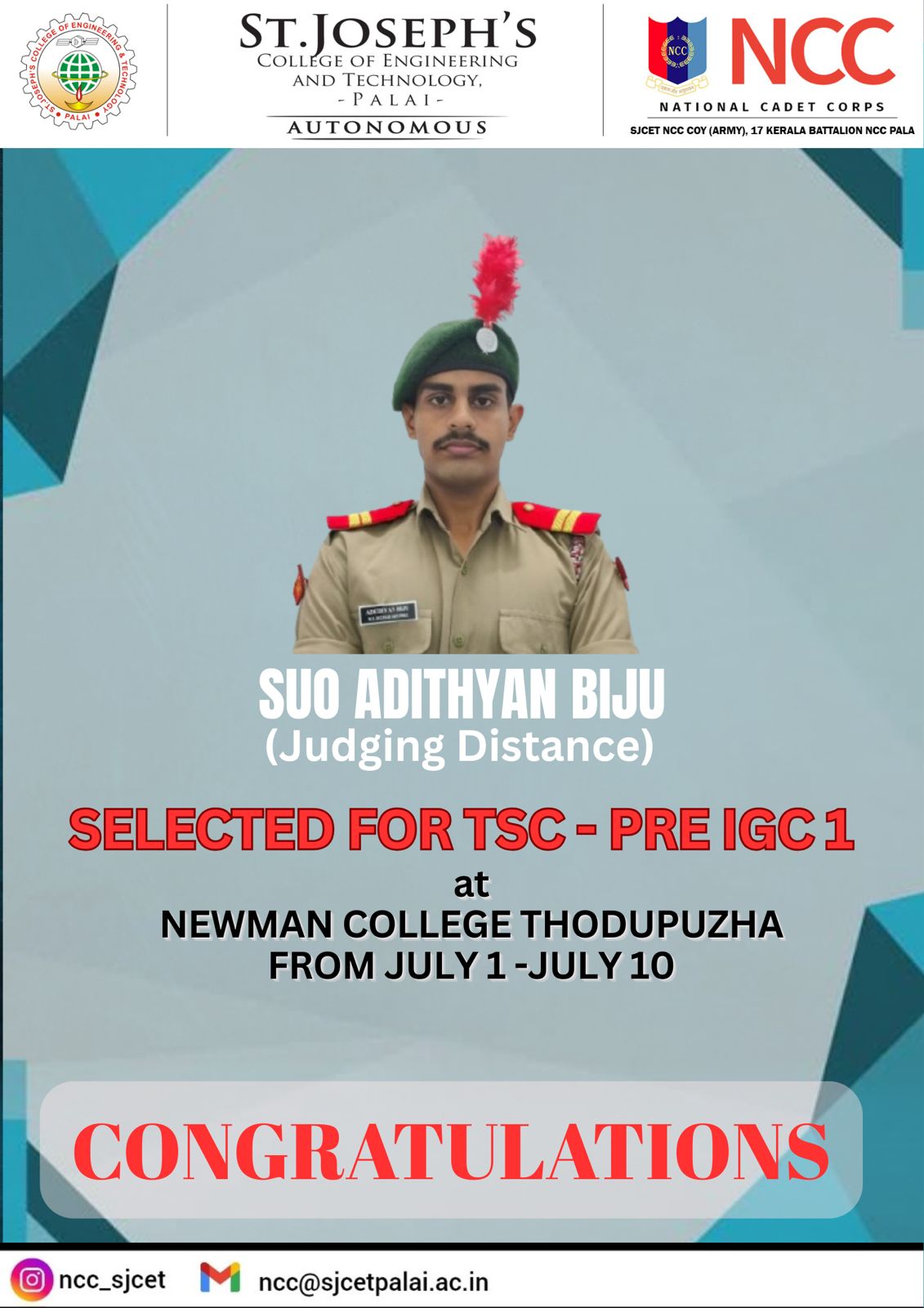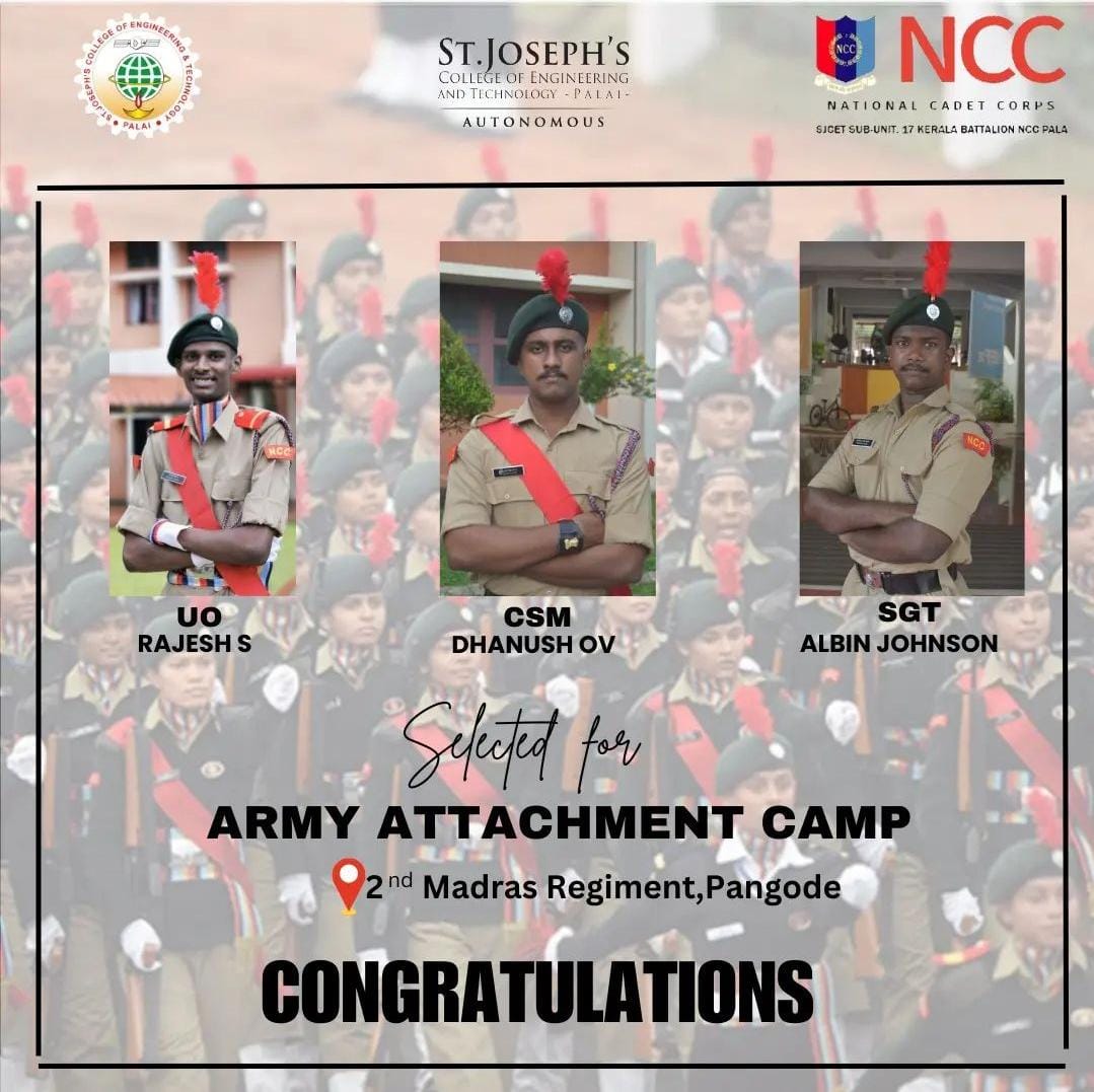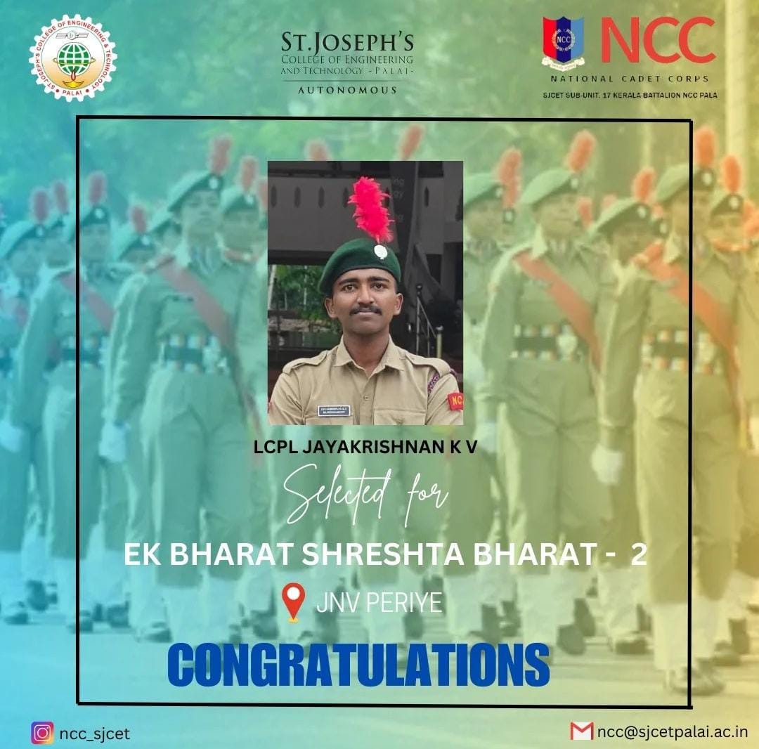 The National Cadet Corps (NCC) enrollment for the 2024–2027 batch at SJCET began with a structured process involving eligibility criteria such as physical fitness and academic qualifications. Interested students were required to submit application forms, usually available through educational institutions or the official NCC website. The NCC program focuses on building discipline, leadership qualities, and patriotism among youth. Since dates and procedures can vary by region, candidates were advised to consult their respective NCC units or educational institutions for accurate details. The enrollment process offered students a valuable opportunity to be part of a nationally recognized youth development organization.