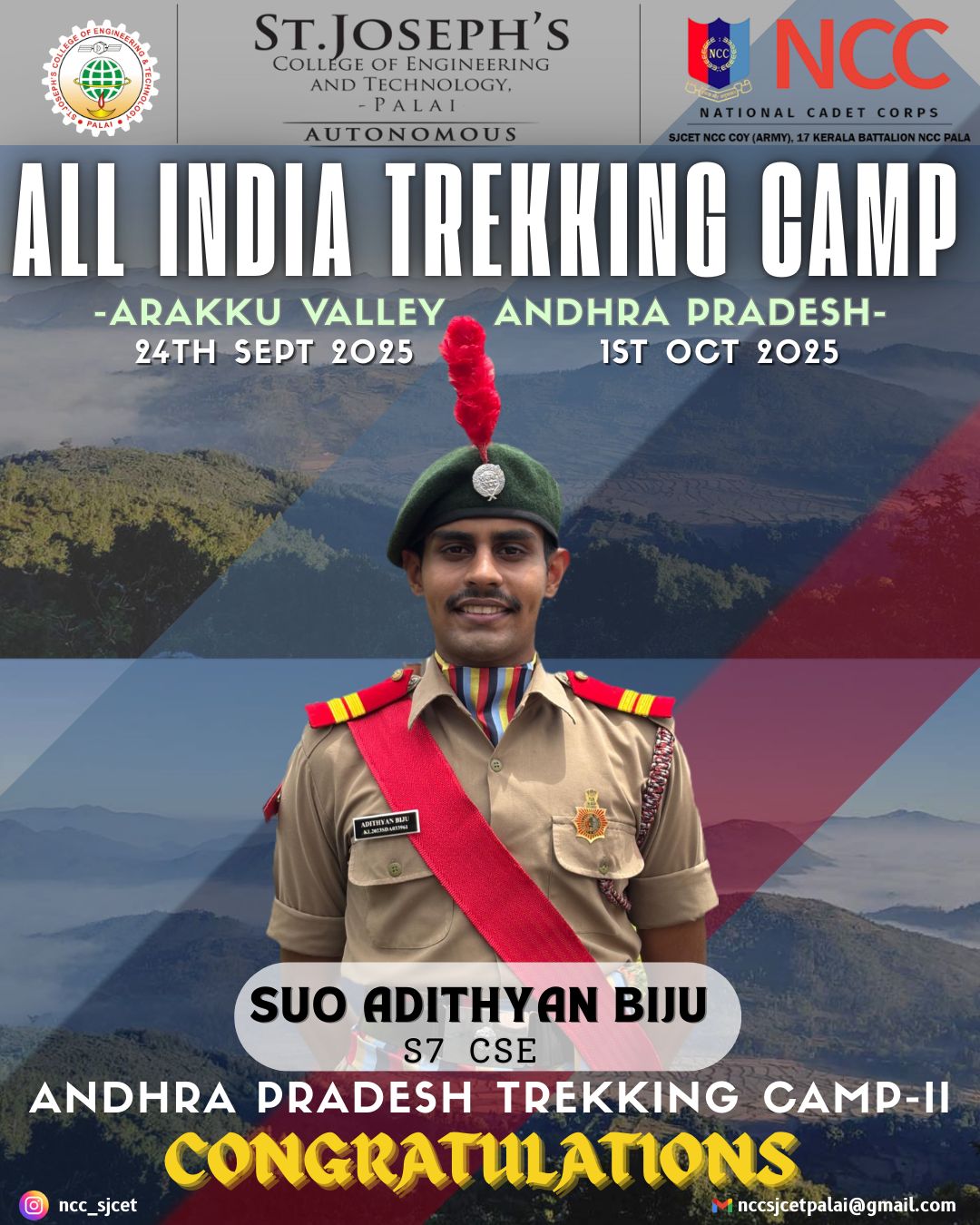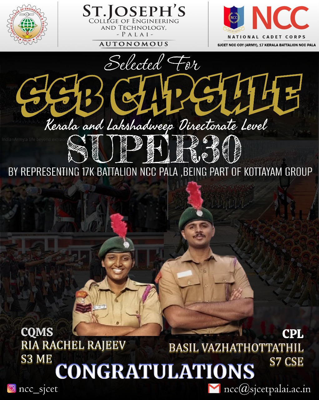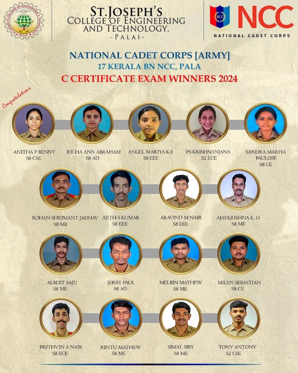 The National Cadet Corps (NCC) enrollment for the 2024–2027 batch at SJCET began with a structured process involving eligibility criteria such as physical fitness and academic qualifications. Interested students were required to submit application forms, usually available through educational institutions or the official NCC website. The NCC program focuses on building discipline, leadership qualities, and patriotism among youth. Since dates and procedures can vary by region, candidates were advised to consult their respective NCC units or educational institutions for accurate details. The enrollment process offered students a valuable opportunity to be part of a nationally recognized youth development organization.
