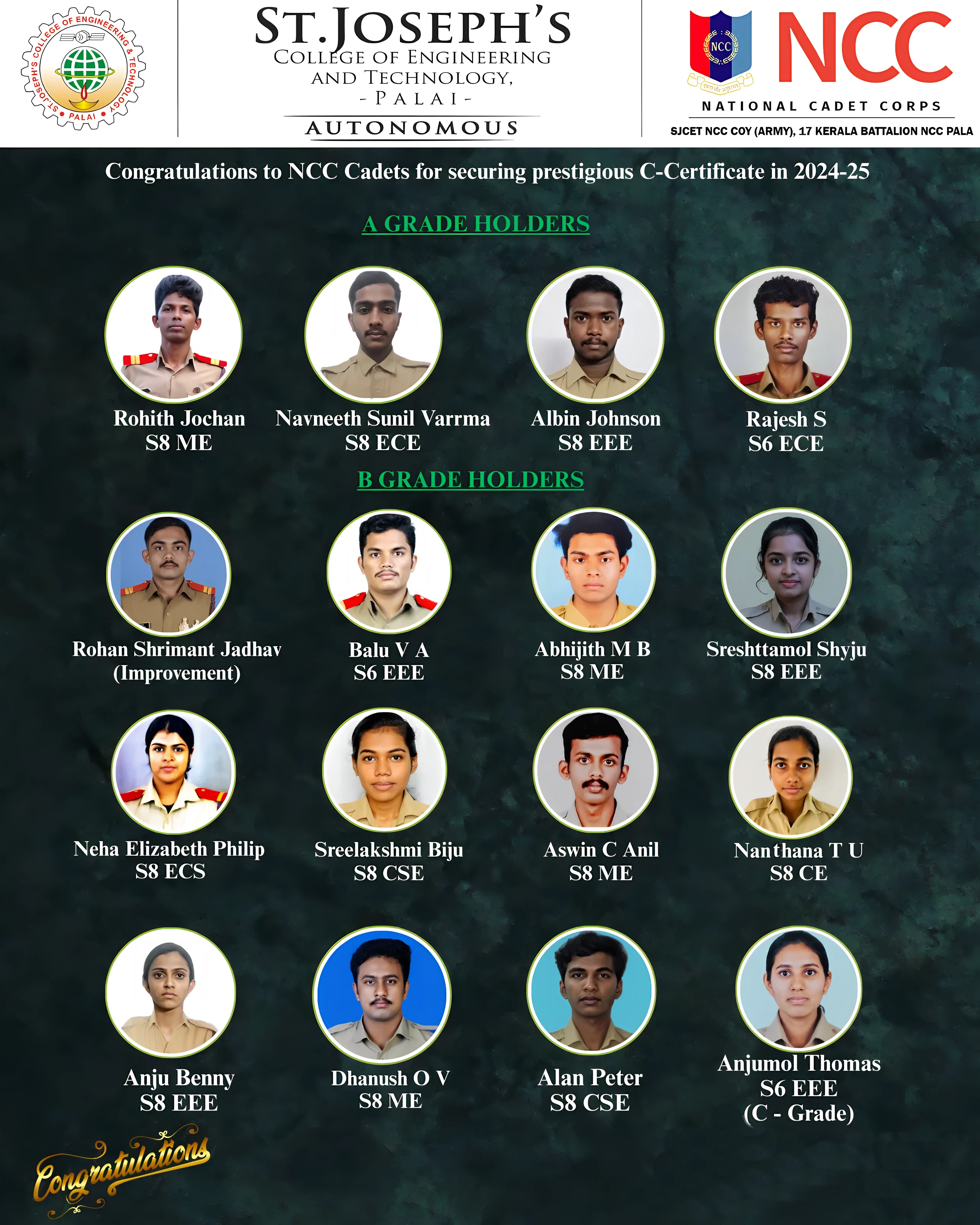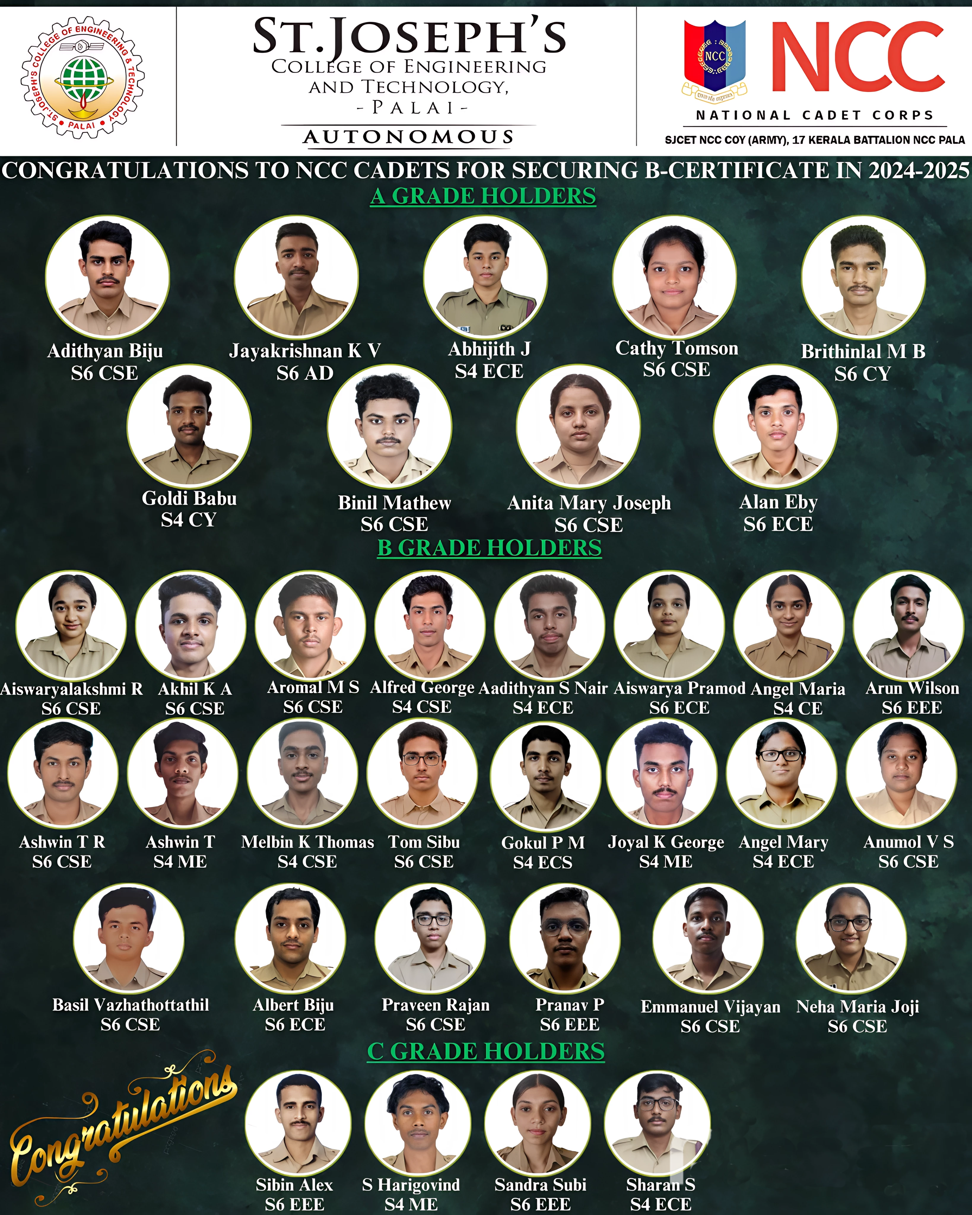 On 15th and 16th February 2025, NCC cadets of SJCET, under the 17 Kerala Battalion NCC Pala, appeared for the NCC C-Certificate Examination held at Baselios College, Kottayam. The event was overseen by Care Taker Officer (CTO) Dr. Tomson Thomas, who ensured smooth coordination. The examination marked a significant milestone in the cadets’ NCC journey, assessing their knowledge, training, and overall performance. With dedication and discipline, the cadets demonstrated their commitment to excellence, contributing to the successful and organized conduct of the event. It was a proud moment for the unit and a step toward future leadership.