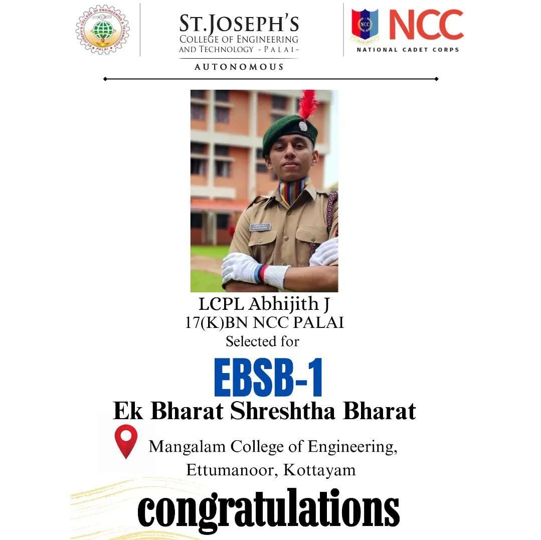 The NCC EBSB (Ek Bharat Shreshtha Bharat) camp was held at Ettumanoor from 21st October to 1st November 2024, aiming to foster national integration and cultural exchange among cadets. L/Cpl Abhijith J represented the SJCET NCC unit at the camp. The event featured cultural performances, interactive sessions, and team-building activities that promoted unity in diversity. Cadets from different regions bonded over shared values and experiences. The camp also emphasized discipline, leadership development, and social responsibility. It provided an enriching platform for cadets to grow personally and culturally, contributing to the spirit of national unity and mutual respect.
