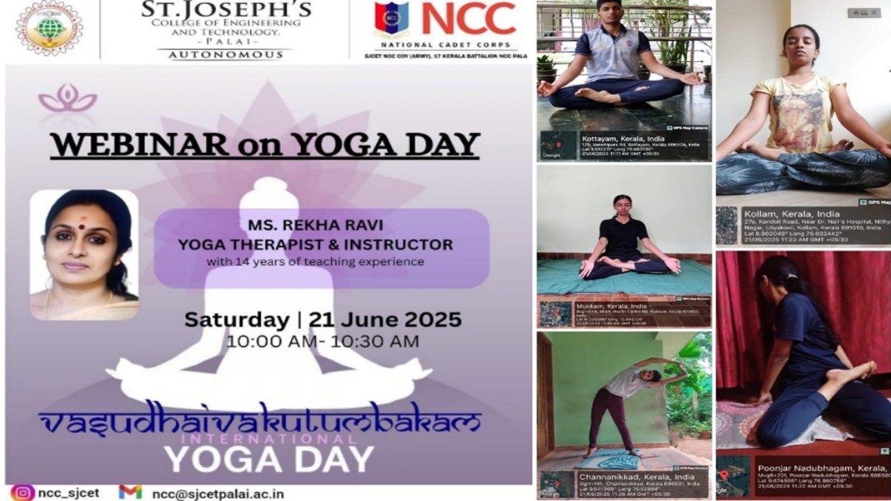 On June 25th,2025, the NCC unit of SJCET Pala observed International Yoga Day with a special session conducted online via Google Meet, led by yoga instructor Ms. Rekha Ravi. During the session, cadets learned the significance of yoga for physical and mental well-being and practiced basic asanas under guidance. After the session, cadets performed yoga independently, posting geotagged photos as part of the celebration. The program emphasized discipline, concentration, and the importance of a balanced lifestyle. It also encouraged cadets to integrate yoga into their daily routine as a means to manage stress and improve overall health and productivity.