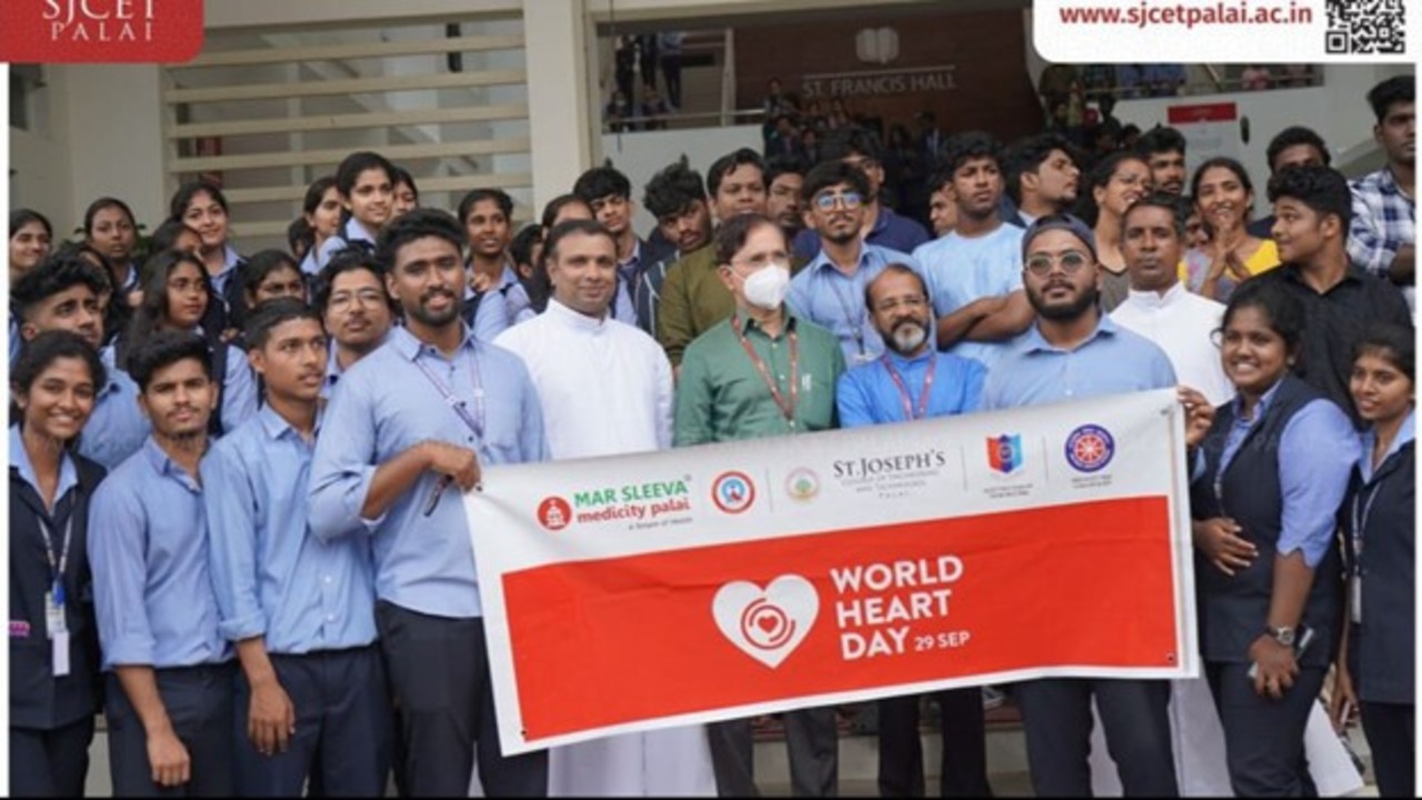 On September 29th, 2023, St. Joseph’s College of Engineering and Technology, Palai, marked World Heart Day with a spirited Flash Mob organized by students in collaboration with Mar Sleeva Medicity Palai. The dynamic performance aimed to raise awareness about heart health, emphasizing the importance of exercise and healthy lifestyles. Medical professionals from Mar Sleeva Medicity enriched the event with valuable insights. Through vibrant dance routines and informative discussions, the celebration effectively promoted cardiovascular wellness. The collaborative effort underscored the college’s commitment to fostering a culture of health and well-being in the community, leaving a lasting impact on participants.