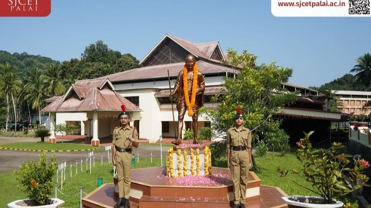 St. Joseph’s College of Engineering and Technology, Palai, observed Gandhi Jayanti with reverence on October 2nd 2023, unveiling a Mahatma Gandhi Statue by Honorable Chairman Msgr. Dr. Joseph Maleparampil. The solemn ceremony, attended by dignitaries and faculty, paid homage to Gandhiji’s principles of truth and non-violence. The inauguration of the newly erected Gandhi statue marked a significant event. Following the statue’s inauguration, the floral tribute was done by NCC Cadets as a gesture of respect. The statue serves as a timeless tribute to Gandhi’s ideals, inspiring reflection and contemplation on his teachings of peace and social justice. The event underscored the college’s commitment to upholding Gandhian values and fostering a culture of integrity and compassion in the community.