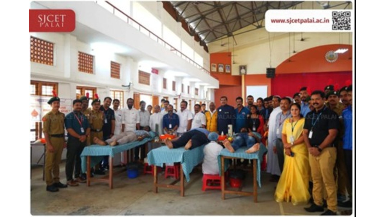 A Blood Donation Camp was jointly organized by NCC SJCET, State Bank of India, Marsleeva Medicity, and NSS SJCET on 25th June 2025. The event was graced by the presence of esteemed dignitaries, including: Ms. Jisha Gopalakrishnan (Pala Regional Manager, SBI), Rev. Dr. Joseph Purayidathil (Vice-Principal) Rev. Fr. John Mattamundayil (Bursar), Ms. Vinetta Vincent (Assistant Manager, Blood Bank, Marsleeva Medicity), Dr. Tomson Thomas (CTO, NCC Coy (Army)) Mr. Justin Jose (NSS Coordinator). The event saw active participation from students, faculty, and cadets, who volunteered to donate blood for a noble cause. Medical professionals ensured proper safety and hygiene standards throughout the camp. NCC cadets took leadership roles in managing registrations, assisting donors, and spreading awareness about voluntary blood donation.